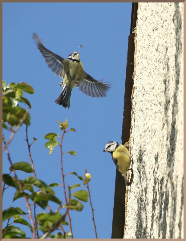 Several Blue Tits were feeding from the west facing wall of our house, perching on the rough wall coating and chasing after insects flying from the adjacent foliage. The 2 birds are montaged for effect, but the top bird & insect are positioned as in the camera original.