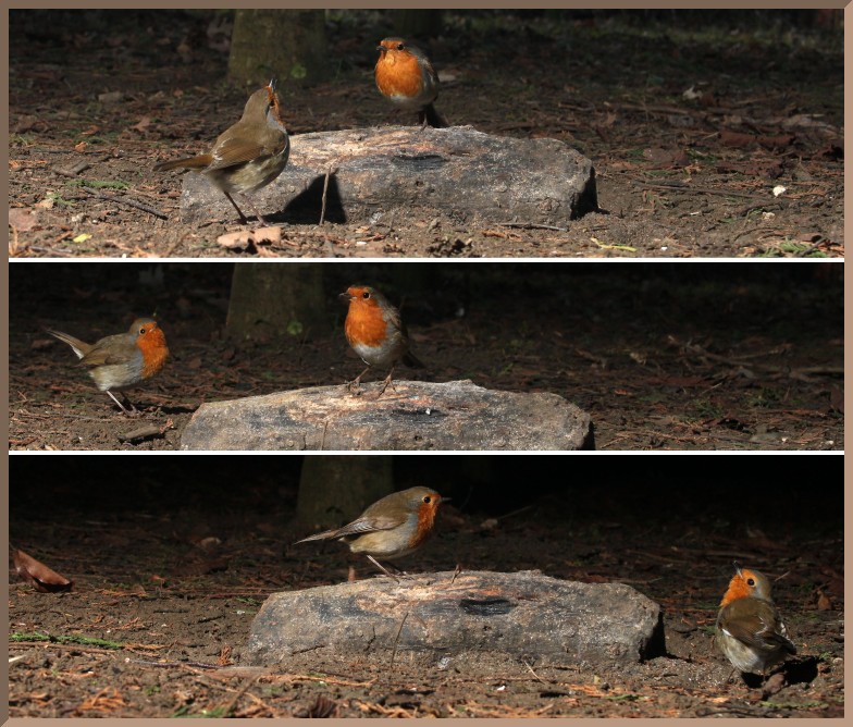 The Robin over the stone is actually in the air without the bird on the ground (back to us)