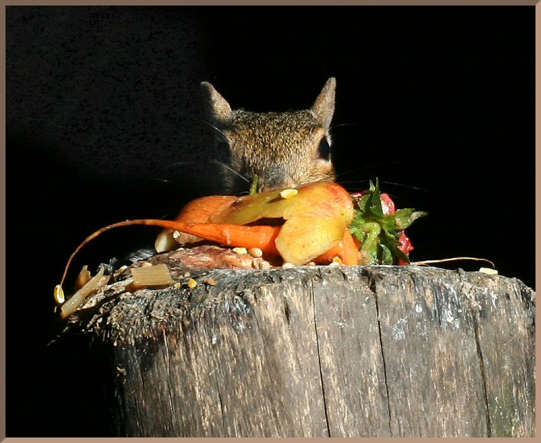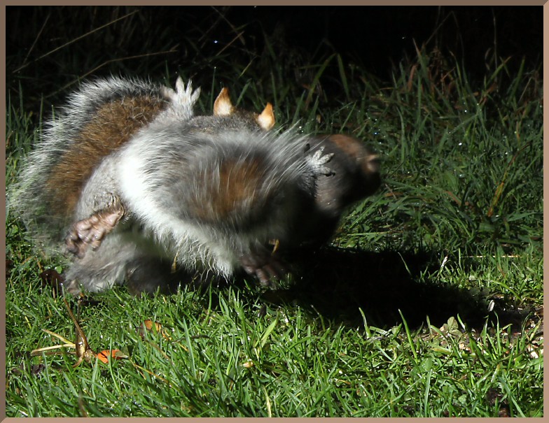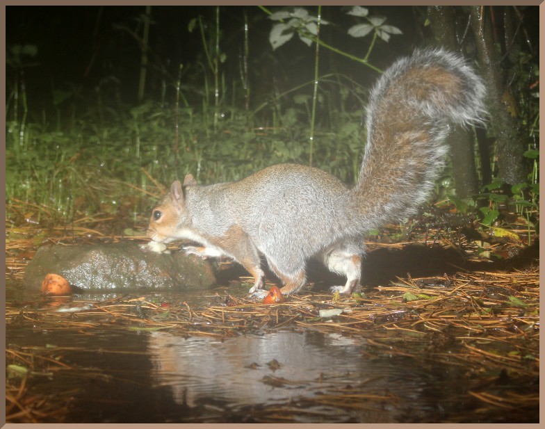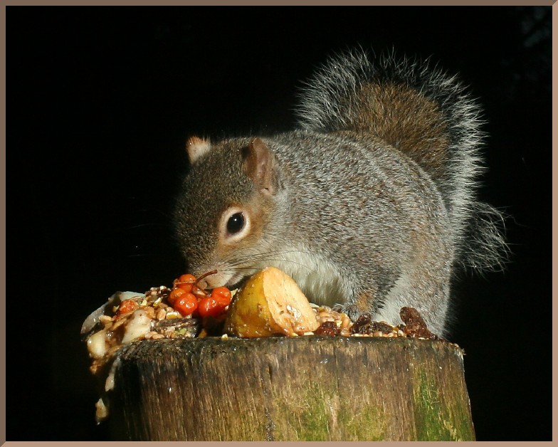 This Grey Squirrel has found something to eat even after the nighttime visitors.
